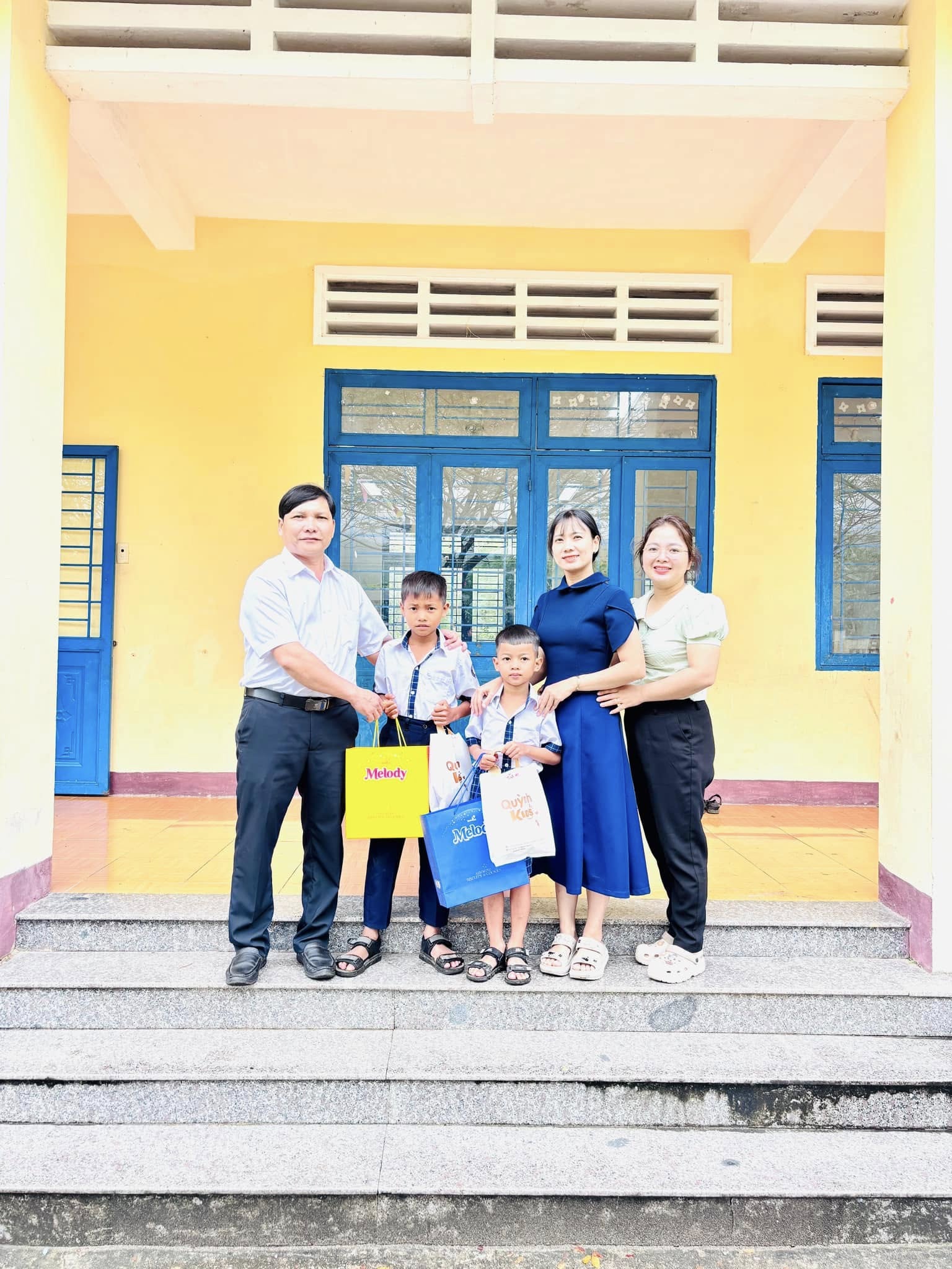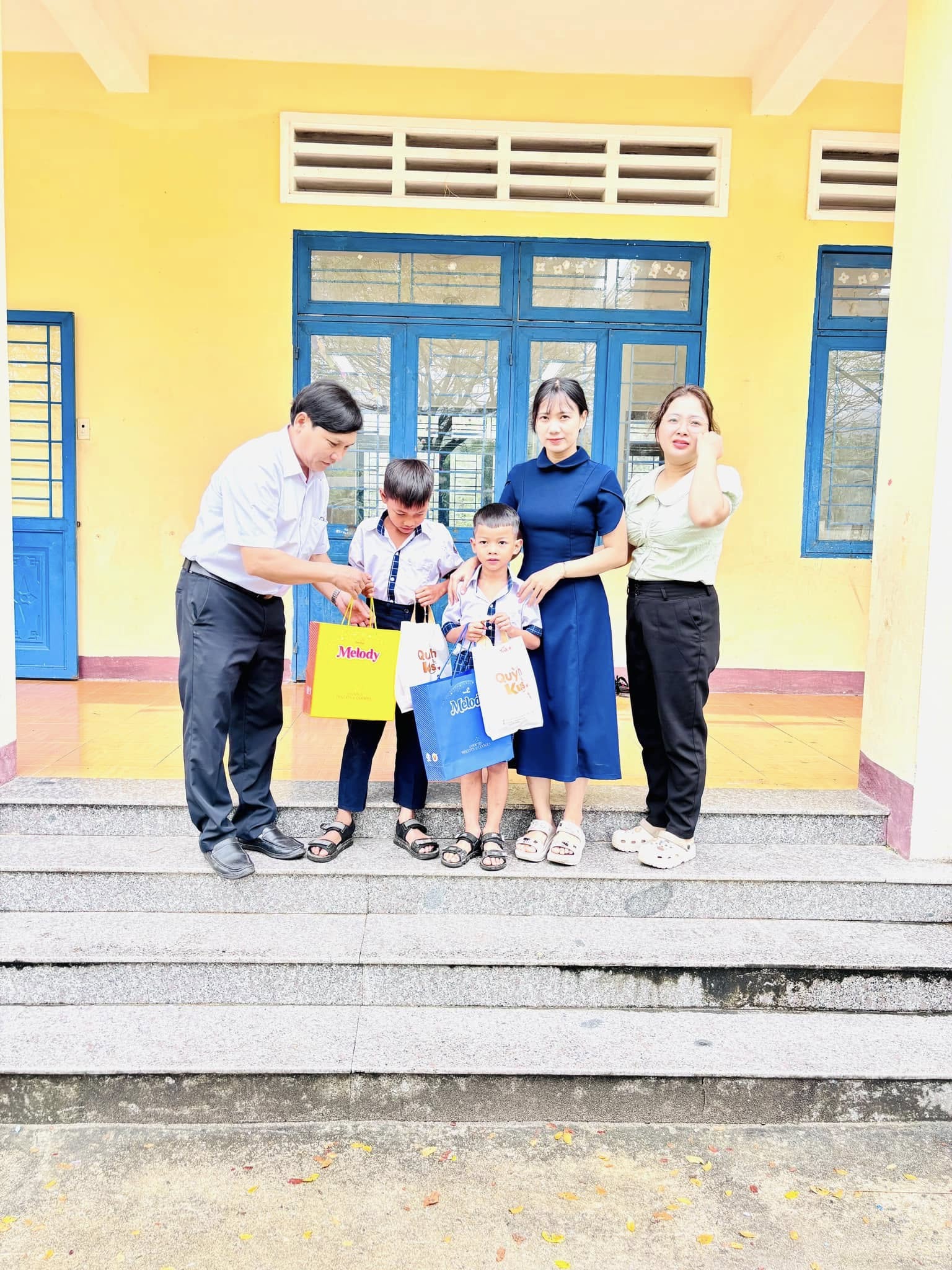 • Đoàn Thiện nguyện tỉnh Quảng Ngãi, chị Truyền Huỳnh và anh Tuấn Anh tặng quà cho học sinh khó khăn điểm trường Trũng Kè 1